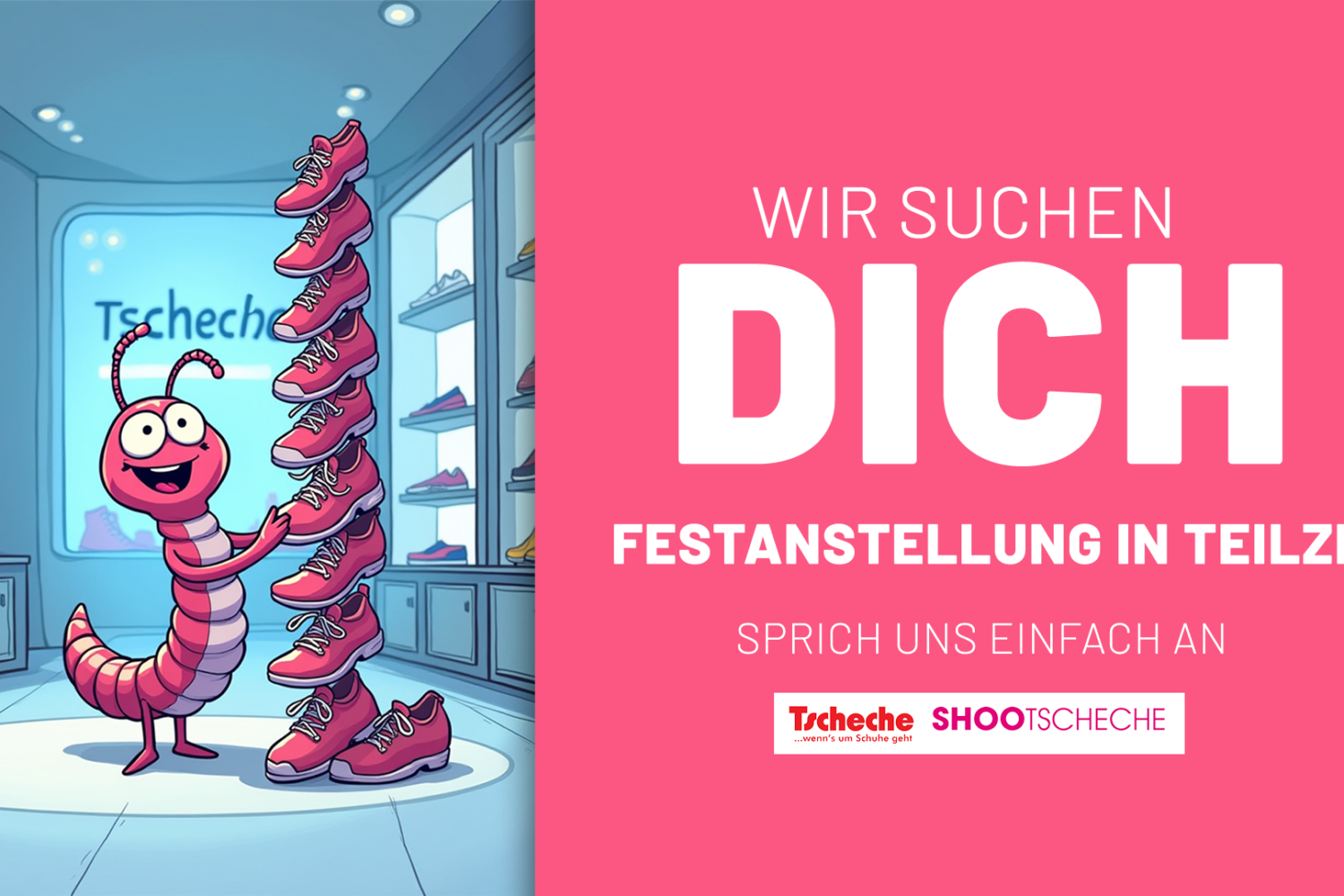 Der Arbeitsmarkt hat sich verändert, und klassische Stellenanzeigen reichen oft nicht mehr aus, um Fachkräfte und Nachwuchstalente zu gewinnen. Genau hier setzt das Schuhhaus TSCHECHE an: Die neue Kampagne ist mutig, anders und spricht gezielt junge Menschen an. Statt trockener Jobanzeigen erobert ein Tausendfüßer die Social-Media-Kanäle und sorgt mit seiner witzigen und sympathischen Art für Aufmerksamkeit.